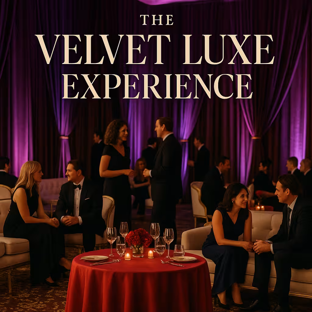 Dining is enhanced with gold-plated chafing dishes, formal Bone China place settings, and full glassware including wine, water, and champagne glasses at each place setting. The Velvet Luxe Experience also features full plated dinner service through our curated list of preferred caterers, ensuring every guest enjoys a refined culinary experience. This collection includes ceremony décor, exclusive engagement photo access, and an Airbnb bridal suite option for convenience and elegance.